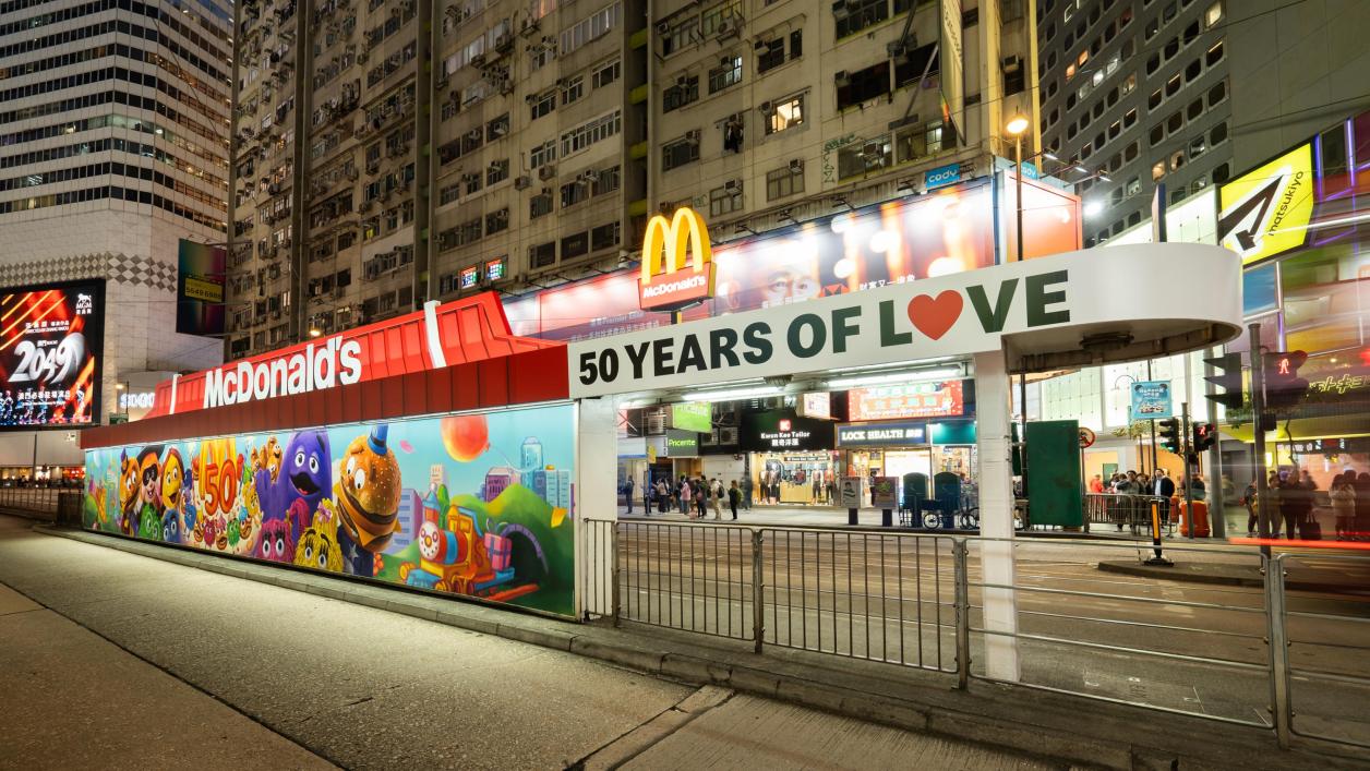Located across from their first-ever Hong Kong location in 1975, the Paterson Street Tram Shelter is transformed into a classic McDonald’s restaurant, complete with an illuminated golden arches sign and iconic 2D roof shaped Sheltertop.